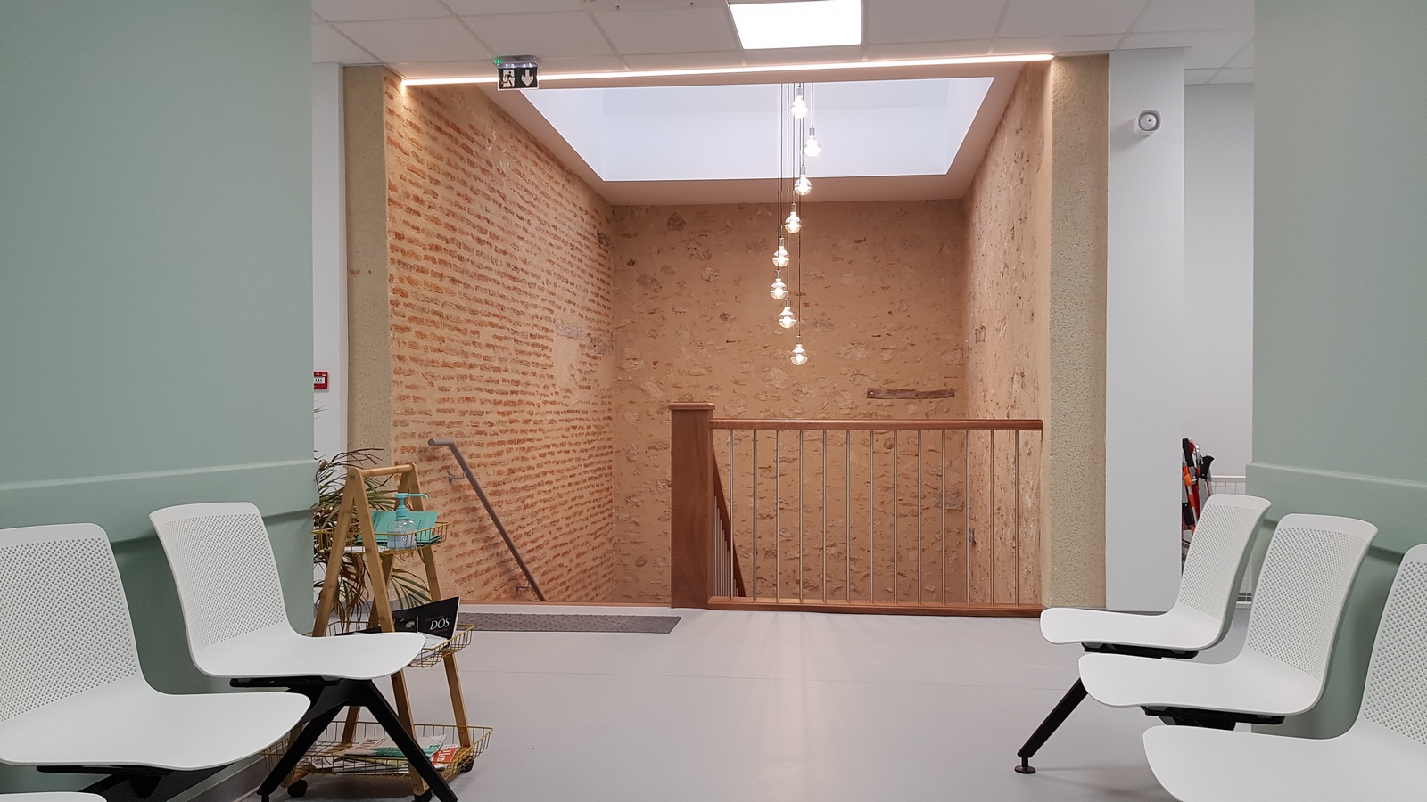 Le rez-de-chaussée est composé du guichet d’accueil, des salles de soins d’infirmiers et de deux cabinets pour les médecins généralistes.